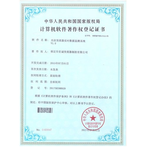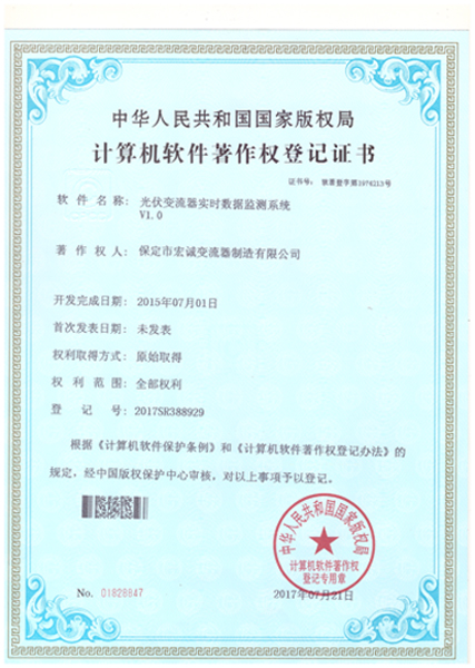 計(jì)算機(jī)軟件注冊(cè)權(quán)登記證書(shū)——光伏變流器實(shí)時(shí)數(shù)據(jù)檢測(cè)系統(tǒng)V1.0